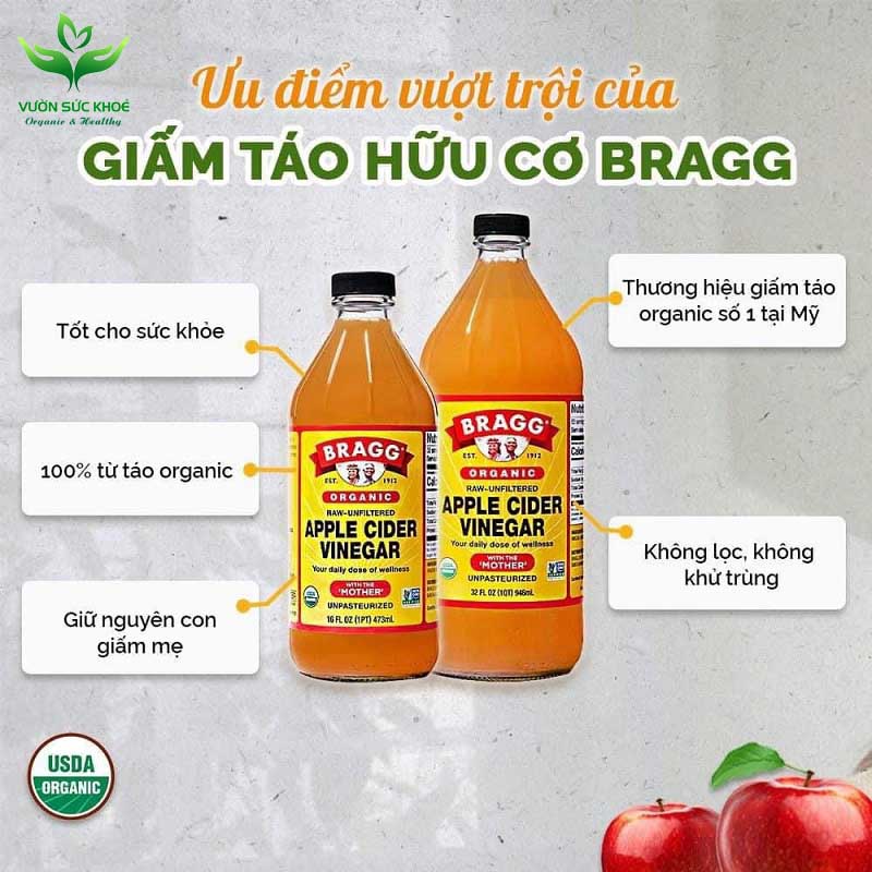 Giấm táo hữu cơ Bragg là thương hiệu nổi tiếng nhất nước Mỹ và toàn cầu. Đây là loại giấm đạt tiêu chuẩn hữu cơ USDA Organic. Đây cũng là loại giấm hữu cơ có chứa 5% acid được làm từ táo hữu cơ được trồng tại Hoa Kỳ, có giấm cái, thực sự “sống”, không khử trùng và không lọc. Quá trình thu hái, sản xuất, đóng gói, bảo quản, vận chuyển đều tuân thủ nguyên tắc chặt chẽ của cơ quan thuốc và thực phẩm của Hoa Kỳ FDA. Chính vì vậy mà màu sắc của giấm rất đặc trưng là từ màu hổ phách tới nâu vàng.