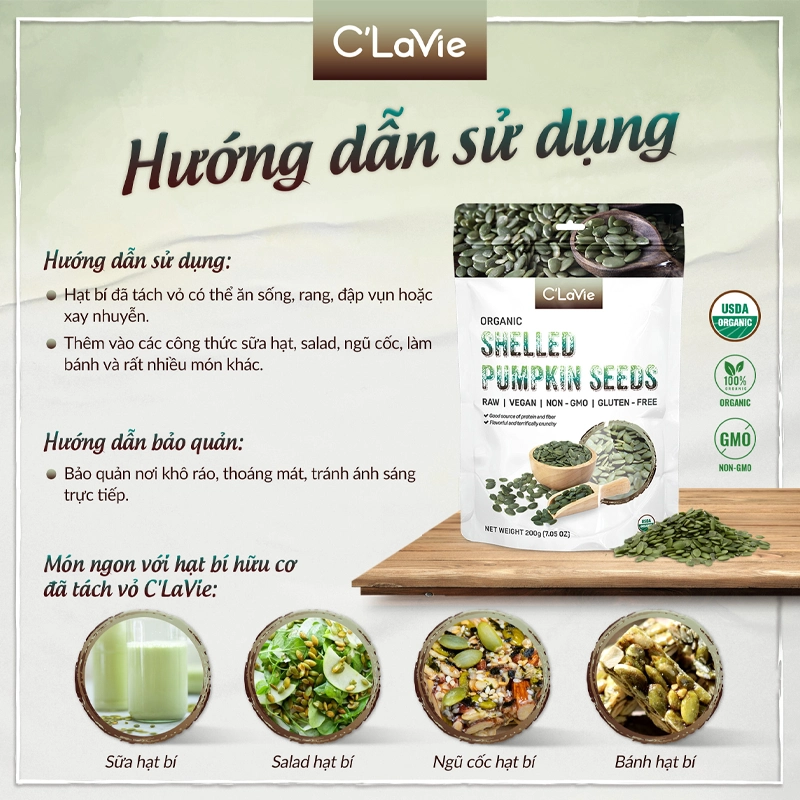 Hướng dẫn sử dụng: Hạt bí đã tách vỏ có thể ăn sống, rang, đập vụn hoặc xay nhuyễn. Thêm vào các công thức sữa hạt, salad, ngũ cốc, làm bánh và rất nhiều món khác.