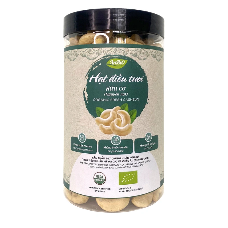 Hạt điều nhân trắng hữu cơ AnBiO đáp ứng và vượt tiêu chuẩn nghiêm ngặt của Châu Âu, và Bộ Nông Nghiệp Hoa Kỳ, được cấp giấy Chứng nhận organic của ên minh Châu Âu EU và Bộ Nông Nghiệp Hoa Kỳ USDA, khẳng định cùng cam kết chất lượng sản phẩm với sức khỏe người tiêu dùng.