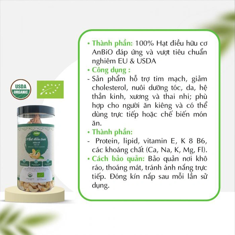 - Hạt điều nhân trắng hữu cơ AnBiO rất tốt cho tim mạch, ngừa cholesterol, nuôi dưỡng tóc và da, tốt cho hệ thần kinh,… phù hợp trong chế độ ăn kiêng.